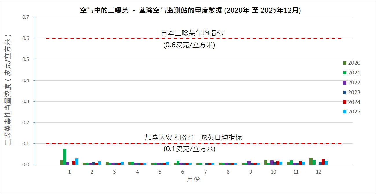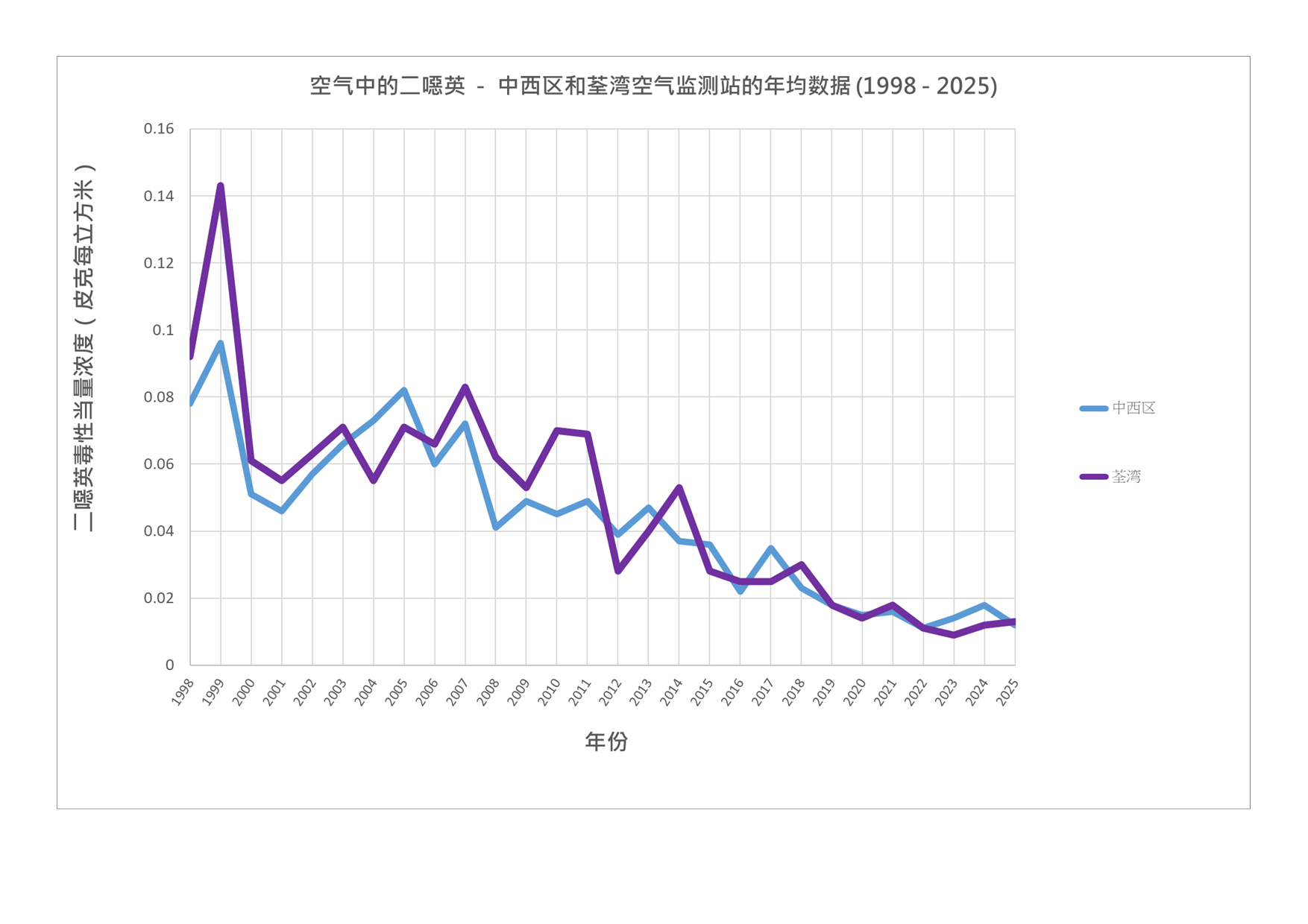 - 香港的二恶英含量较低,并呈普遍下降趋势。由于季节性因素,因此冬季的二恶英含量普遍高于夏季。